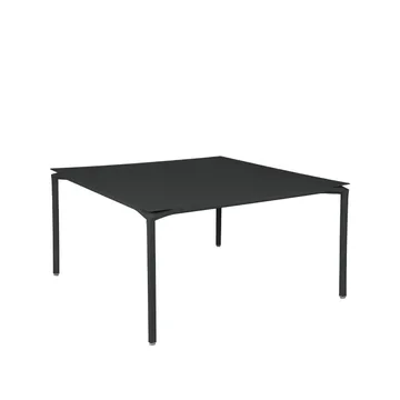 Calvi bord, kvadratisk 140x140 cm fra Fermob er et kvadratisk aluminiumsbord med en tydelig definert svevende bordplate, designet av Antoine Lesur. Den visuelle åpningen mellom bordplate og ben i hvert hjørne gir konstruksjonen et lett og presist uttrykk samtidig som stabiliteten opprettholdes. Bordplaten i aluminiumsplate hviler på en understell i aluminiumrør med høydejusterbare føtter som gir en jevn plassering selv på ujevnt underlag. Den kvadratiske formen rommer opptil åtte personer og fungerer like godt på terrasse som i hage. Bordet er laget av aluminium med UV-bestandig og korrosjonsbeskyttet belegg for langvarig bruk utendørs.